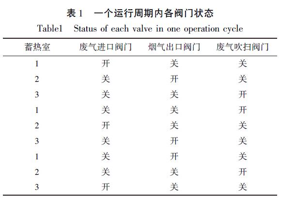 程因?yàn)槭峭ㄟ^程序控制氣動(dòng)調(diào)節(jié)閥工作, 能在短時(shí)間內(nèi)切換閥門狀態(tài), 保證三個(gè)蓄熱室一次完成蓄熱、放熱和吹掃的過程。在一個(gè)運(yùn)行周期內(nèi)每個(gè)蓄熱室下的閥門切換狀態(tài)如表1 所示。