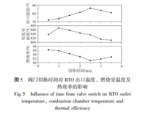 分, 不利于提高熱效率和廢氣處理效率。同時(shí), 熱效率也隨著切換時(shí)間的增加而減少, 不利于VOCs 的高效處理和余熱利用。切換時(shí)間的逐漸增加在2 ~ 2. 5 min 時(shí), 蓄熱室吸收的熱量增加, 導(dǎo)致蓄熱室與煙氣的溫差減小, 排氣出口溫度升高, 且燃燒室溫度和熱效率仍有降低。隨著切換時(shí)間的進(jìn)一步增加到2. 5 分鐘以上, 進(jìn)氣過程的蓄熱室溫度進(jìn)一步下降, 導(dǎo)致進(jìn)氣蓄熱體和燃燒室中的氣體溫度繼續(xù)下降, 在排氣過程中供給蓄熱體吸收的熱量減少, 排氣出口溫度開始下降, 有利于熱效率的提高。